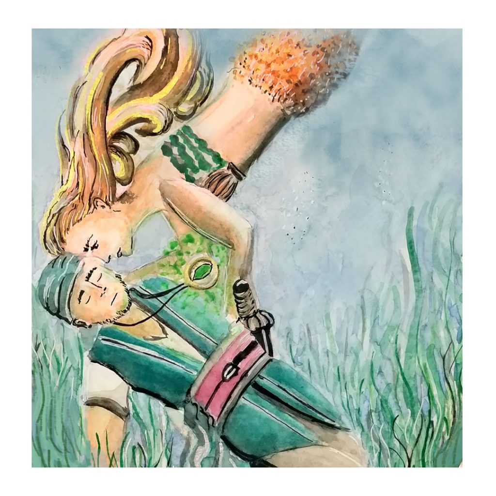 En effet, cette couleur est associée à l’énergie ainsi qu’à l’action. Sa chevelure de feu et sa queue ont des couleurs à l’opposé ( c’est à dire des couleurs complémentaires) de l’environnement où elle vit avec le bleu de la mer. En plus, j’ai ajouté à l’aquarelle quelques points d’or.